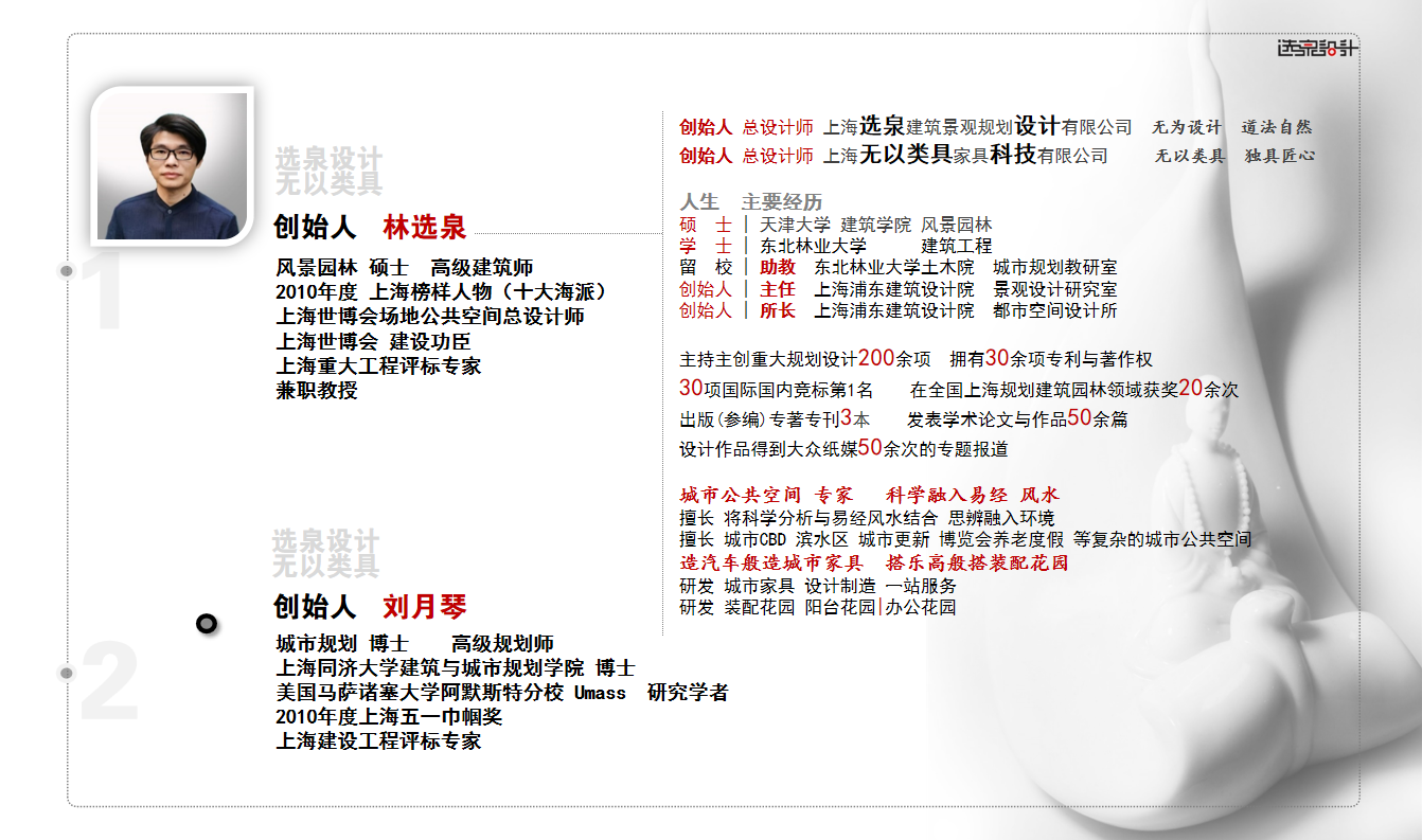 公司由上海世博會場地公共空間總設(shè)計師、2010上海榜樣人物林選泉與同濟大學建筑城規(guī)學院博士、美國Umass研究學者劉月琴聯(lián)合創(chuàng)立。