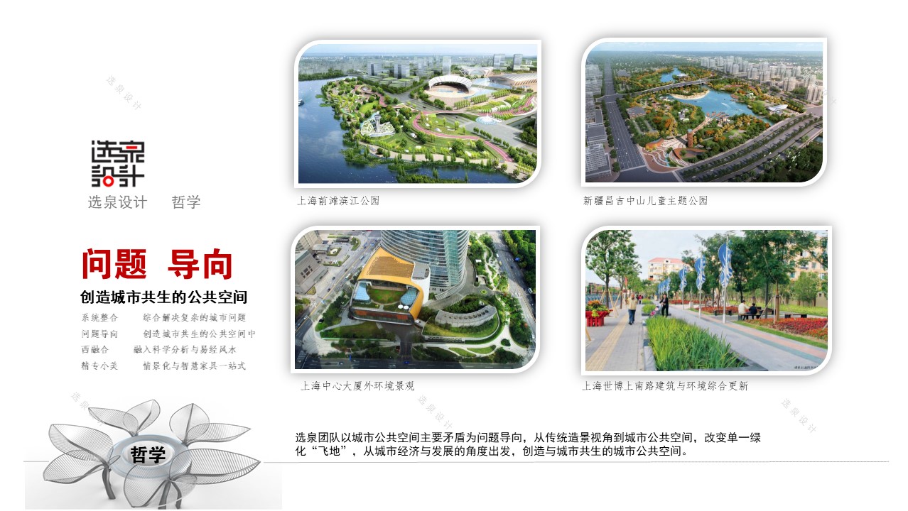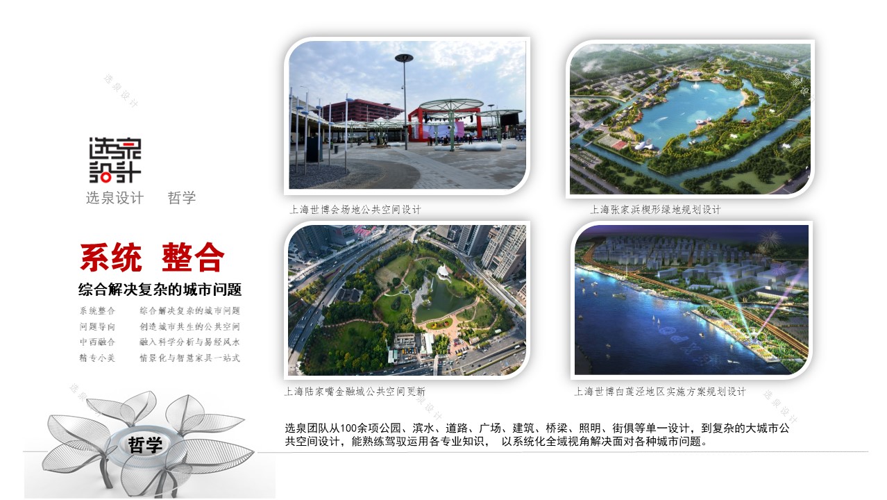 選泉團隊從100余項公園、濱水、道路、廣場、建筑、橋梁、照明、家具等單一設(shè)計,到復雜的大城市公共空間設(shè)計,能熟練駕馭運用各專業(yè)知識, 以系統(tǒng)化全域視角解決面對各種城市問題。