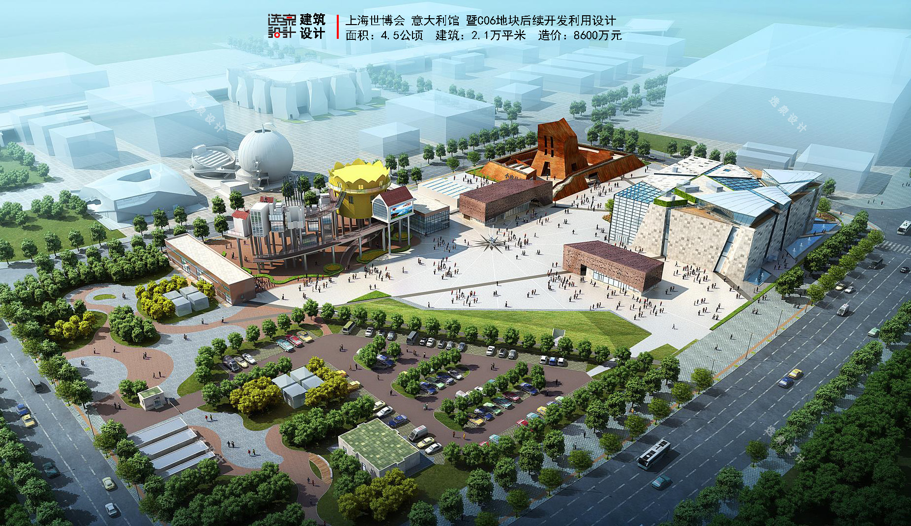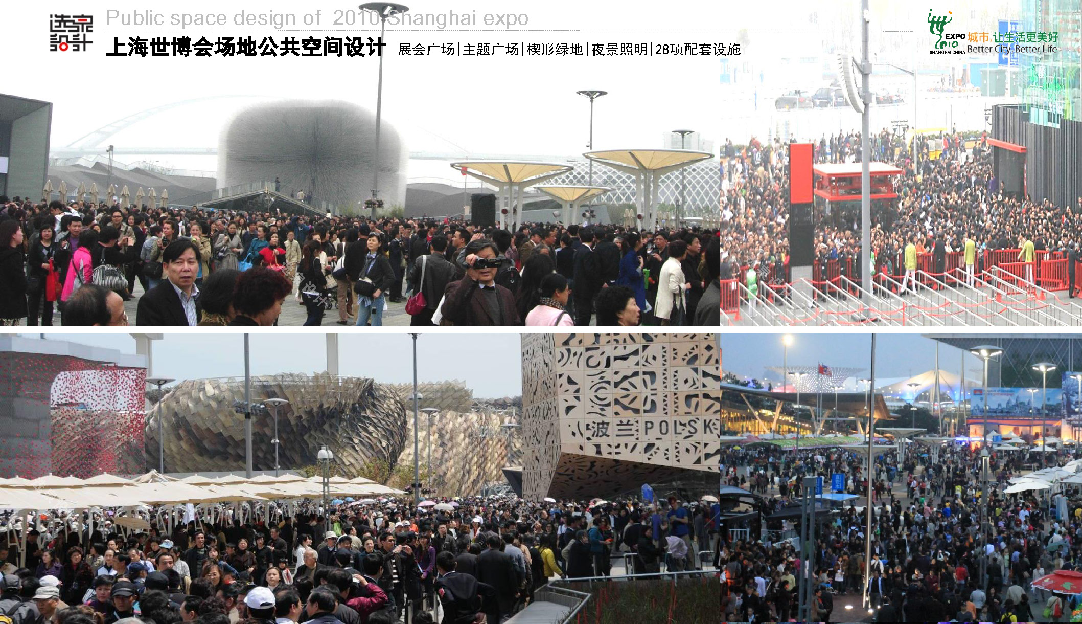 除了設(shè)計好5大洲主題廣場20多個展會廣場、楔形綠地、30多類配套設(shè)施外并保證與形態(tài)各異的展會建筑和諧有序運轉(zhuǎn)。設(shè)計成功應對了游客巨大性、天氣惡劣性、場地臨時性、建設(shè)動態(tài)性、內(nèi)容龐雜性等挑戰(zhàn),合理有序的落實大量配套設(shè)施的基礎(chǔ)上,滿足為展館提供室外展示、演出、休閑、排隊等候以及人流疏散等功能需求,將室外空間被動等待變成積極的參觀游覽,營造一個快樂交流、體驗互動、文化多元的世博公共空間。