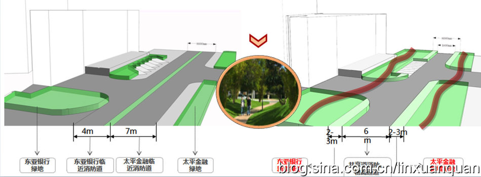 以東亞和太平金融街坊路為例,東亞銀行東側(cè)界面狹窄,為停車場和綠化。通過共享消防與物流通道,各自綠地空間增加3m寬。