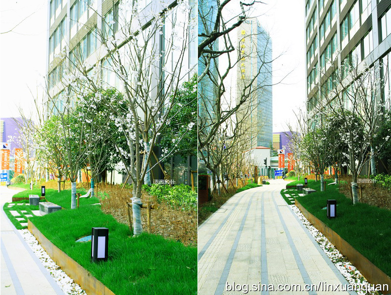 金磚大廈西側(cè)道路僅保留4M作為消防車道,增加3M寬綠化帶,設(shè)置林蔭路。