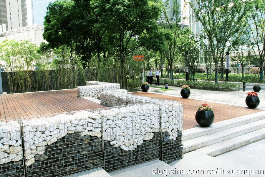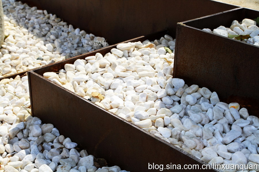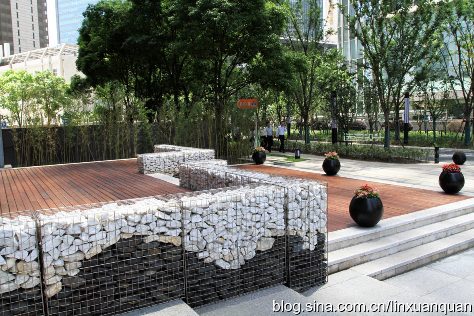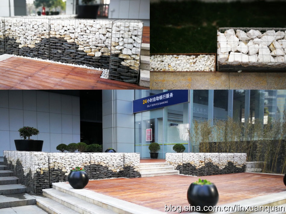 林蔭健身步道的休閑空間,置入石籠墻與坐凳,純粹的河石、樸拙的景墻與周邊的商務(wù)樓形成強烈對比,形成自然與時尚、鄉(xiāng)土與現(xiàn)代的矛盾、融合。在南方天然河道里,人工精心挑選天然的黑、紅、白色河石,堆砌出自然石墻肌理,并用細不銹鋼筋網(wǎng)片筑成籠罩固定。