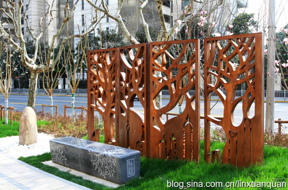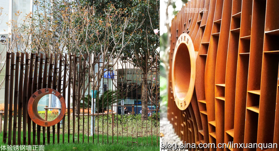 用薄的銹鋼片作為簡單幾何單元,“橫向”或者“豎向”間隔重復形成銹鋼景墻,當視線與薄銹鋼片垂直,景墻“消失”,墻后的景色透露眼簾,形成傳統(tǒng)園林“透景”意境。當視線與銹鋼片呈斜角,銹鋼片重疊形成密實的銹鋼墻。行進的人由于視角變化相應銹鋼景墻也呈現(xiàn)出“若有若無”意境。銹鋼因銹蝕程度不同會隨著時間變化而呈現(xiàn)紅色的變化,用這種時間與空間的抽象手法來融入周邊環(huán)境。