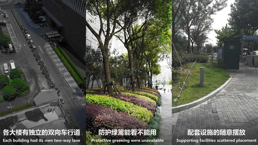 2、同利益方的要求不同。地塊內(nèi)的公共空間是通過地塊共享、集約、置換等方式“擠”出來的,因此方案針對的業(yè)主就有政府管理部門,大廈物業(yè)方(國企和外資),需要協(xié)調(diào)他們不同的需求,有的希望保持防護綠化的現(xiàn)狀,安全且便于管理。有的希望方案有所突破,而城市管理部門傾向于后期方便管理和養(yǎng)護。
