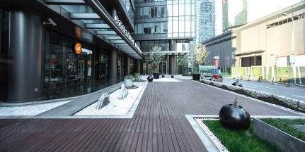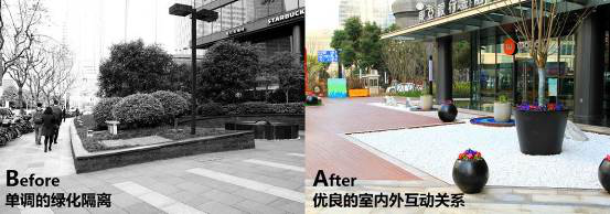 商務(wù)樓的一層一般有接待大廳以及一些休閑接待性質(zhì)的咖啡吧等,并且設(shè)有大型的落地窗,但由于大樓周邊的公共空間主要是一些防護綠地,導(dǎo)致大樓內(nèi)外的景觀沒有相互呼應(yīng)。