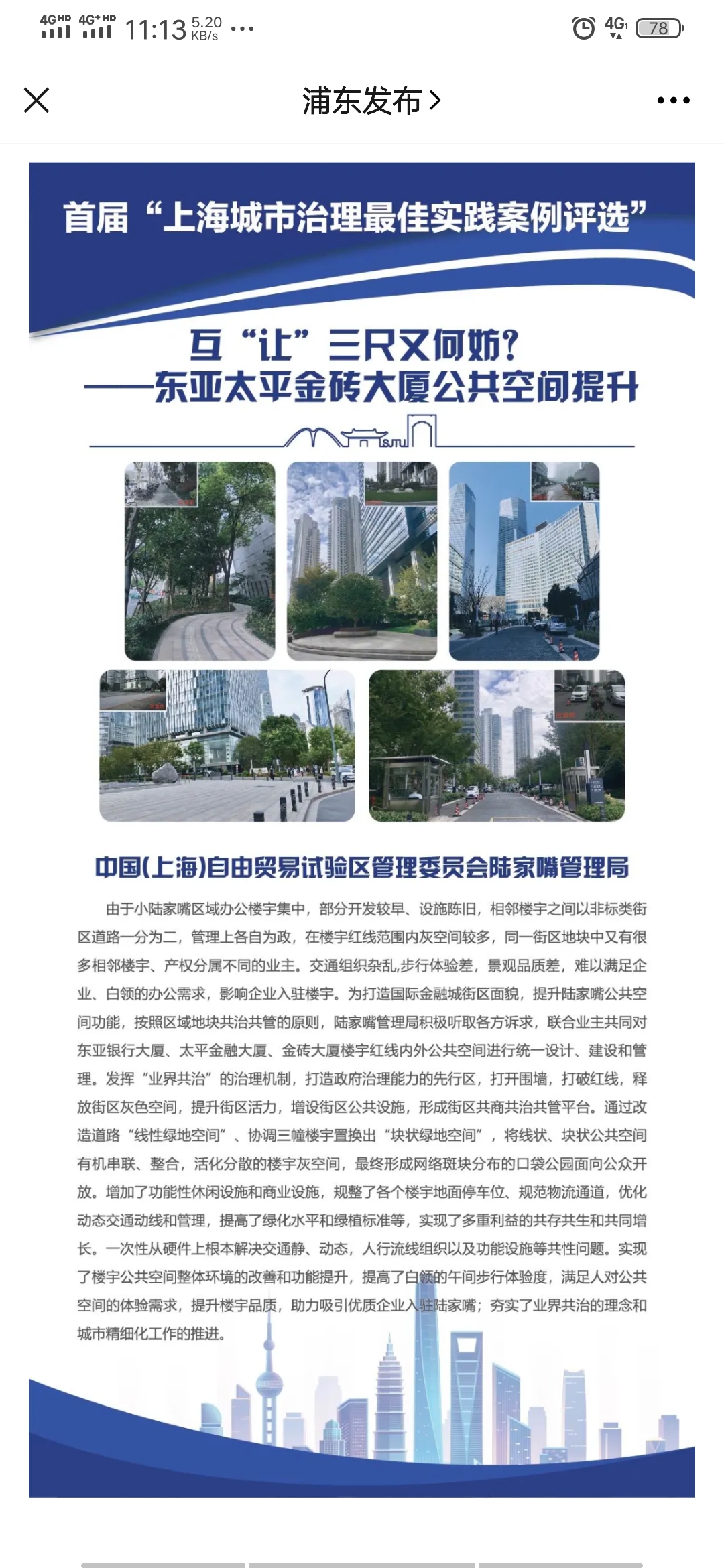 其中,最佳案例10項,浦東有3個案例上榜,我公司設(shè)計參與的項目,由中國(上海)自由貿(mào)易試驗區(qū)管理委員會陸家嘴管理局報送的互“讓”三尺又何妨?——東亞太平金磚大廈公共空間提升。獲此殊榮,是浦東新區(qū)三個獲獎項目之一。
