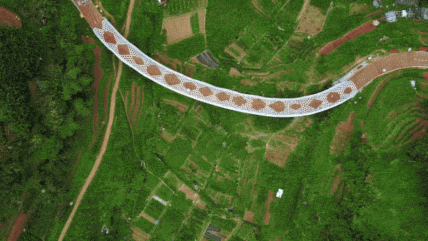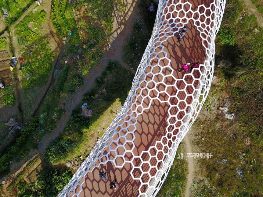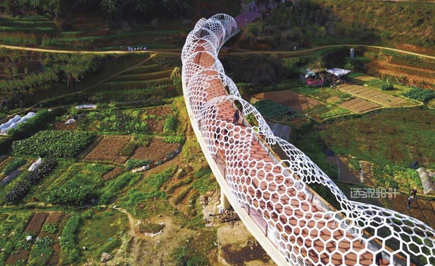 橫跨鳳凰谷80米長的“板凳龍橋”,設(shè)計將大田國家級非物質(zhì)文化遺產(chǎn)“大田板凳龍”的形態(tài)進行抽象