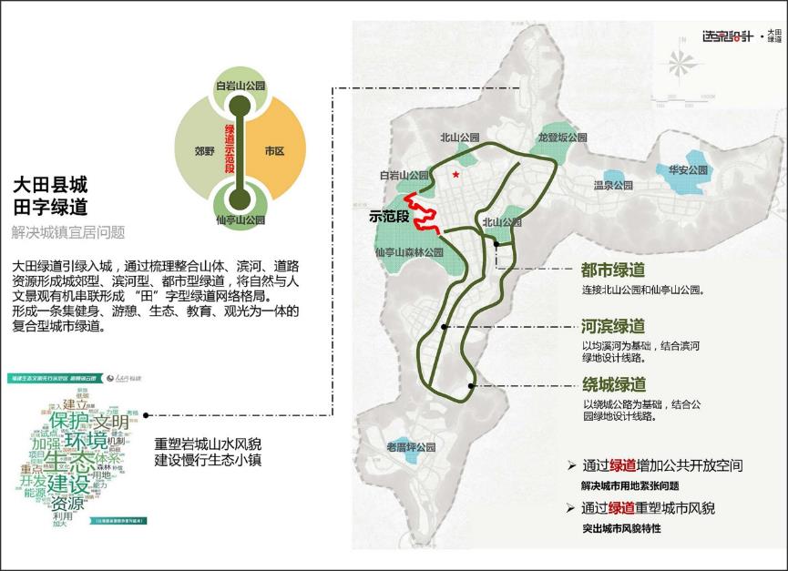 大田綠道引綠入城,通過梳理整合山體、濱河、道路資源形成城郊型、濱河區(qū)、都市型綠道,將自然與人文的景觀有機串聯(lián)形成“田”字型綠道網(wǎng)絡(luò)格局。為城鎮(zhèn)及周邊居民提供生態(tài)、健康的宜居環(huán)境,重塑了大田山水城鎮(zhèn)的風貌。