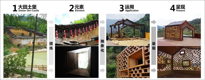 設(shè)計抽象提煉了大田國家級歷史文化保護建筑“土堡”來進行鄉(xiāng)土文化傳承,用“虛實相間”的木網(wǎng)格象征土堡的土墻、 “米斗狀”的木窗象征土堡的瞭望窗,鋼管形成土堡的屋檐。會隨時間變化的紅色銹鋼來象征大田特有的“紅壤”并融入周邊環(huán)境。