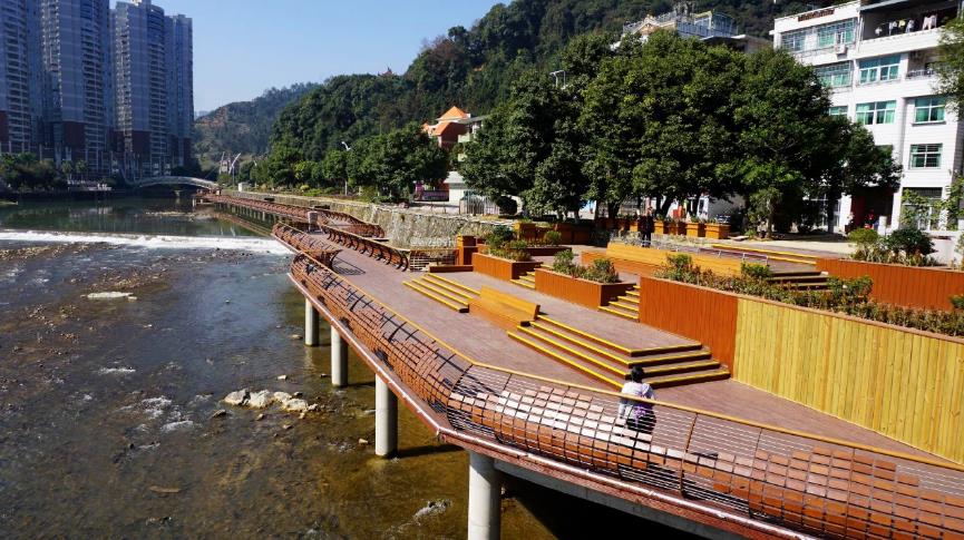 大田綠道濱河示范段始于縣城南門,連接老城區(qū)濱河棧道,向城郊濱河綠道過渡,整體風格設(shè)計呈現(xiàn)出從人工到自然過渡。為改變均溪河一刀切防汛墻導致親水性差的現(xiàn)狀,離水面1米多高處設(shè)置4米寬的木棧道,打造大田第一條真正意義上的親水的棧道。