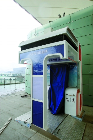 ??現(xiàn)在5.28平方公里的世博園區(qū)里會有1.1萬多個廁位。做保潔的大嫂告訴記者,他們每天要用9種不同的清潔液擦洗各種設施,門把手一個小時就要擦一次。每人配備1.5瓶直飲水
