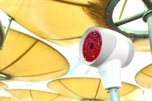 ??記者在園區(qū)內看到很多白色半圓形球體,上面罩著寫著中國篆字的紅色網(wǎng)格,它們懸掛的位置比路燈稍低,看起來像個裝飾品。林選泉告訴記者,這是一種噴霧降溫設施,造型的靈感來源于“中國娃娃”。天熱的時候,它們會噴出低溫水霧,令周圍的小環(huán)境降溫5至6攝氏度。