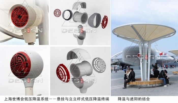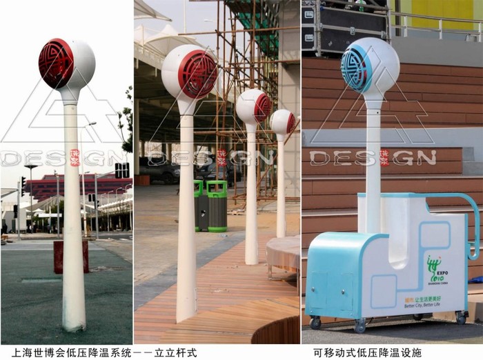 依據(jù)人體舒適度模型以及實(shí)驗(yàn)表明,霧噴降溫設(shè)備宜結(jié)合遮陽(yáng)設(shè)施布置降溫效果明顯好于太陽(yáng)直射下的場(chǎng)地降溫效果。而世博場(chǎng)地降溫系統(tǒng)設(shè)計(jì)采用了“低壓兩相流噴霧降溫系統(tǒng)”,霧噴降溫設(shè)備根據(jù)水霧蒸發(fā)吸熱的原理,以水為原料,利用設(shè)備壓力,使水通過(guò)微孔撞擊霧化,形成自然水霧,以達(dá)到降低局部空間的環(huán)境溫度的效果。由于結(jié)合風(fēng)力輸送,低壓兩相流霧噴技術(shù)相比高壓霧噴技術(shù),具備影響人體舒適度因子中除了“溫度、濕度”外,增加了“風(fēng)速”這一因子,故而,基于人體舒適度的“降溫”效果是更顯著的。
