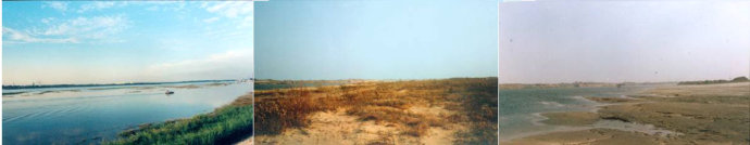 河灘: 松花江大橋橋址河道形成洲灘和島嶼(河套),是由細沙組成,色彩以土黃色為主,中明度、中純度。