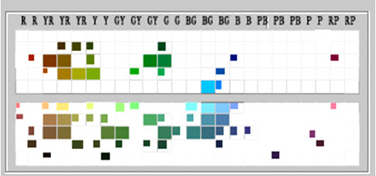 色相:以環(huán)境色中常見的PB-BG(江面天空色相),G-GY(植被色相)、YR-Y(江岸、洲灘色相)以及無色彩的色相范圍中選定候補色。