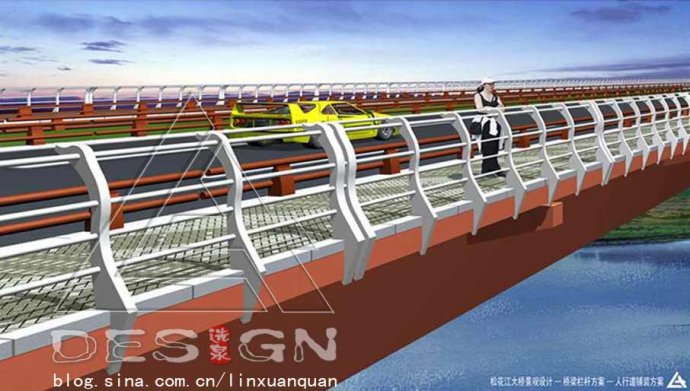 欄桿是用來保障行人或車輛行駛安全、防止墜落或沖撞一種必備的安全設(shè)施,也是與行人最接近的部分,其造型及色彩設(shè)計影響著橋梁的整體景觀。欄桿色彩一般采用溫和亮麗的色,具有易識別記憶和防撞的警示作用,要與橋梁總體造型相統(tǒng)一,與周圍環(huán)境相協(xié)調(diào),要體現(xiàn)欄桿的連續(xù)和韻律感,增強橋梁連續(xù)和流暢感.