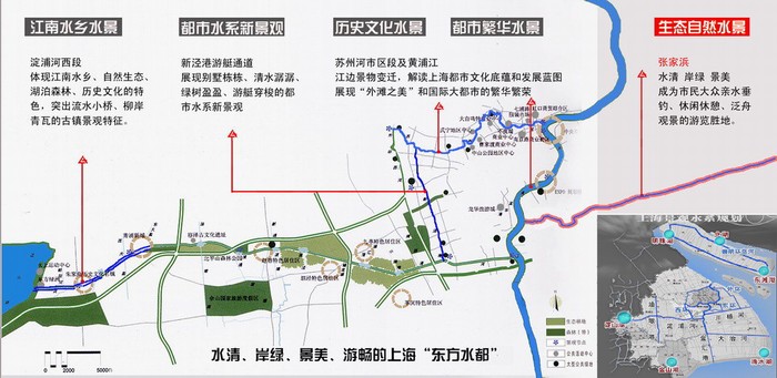 目前,張家浜是上海市惟一的一條較為完整的景觀河道。從黃浦江到長江口,從城市化高度發(fā)展地區(qū)到農(nóng)村,她濃縮著浦東的過去、現(xiàn)在和未來,印證著浦東開發(fā)開放發(fā)展的歷程。對于浦東而言,張家浜不再僅僅是一條只有“綠量”的綠色河道,她還應該是一條歷史文化廊道。