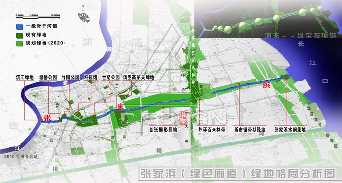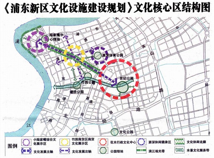 在張家浜河道周邊(東郊賓館、湯臣高爾夫球場、世紀公園、花木行政文化中心、上??萍拣^、竹園商貿(mào)中心、陸家嘴金融中心等)建立相對完整的步行、自行車通道系統(tǒng),在浦東市中心結合成一條綠色的廊道和開敞空間系統(tǒng)(圖6)。