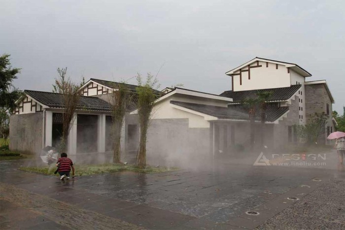 六、設(shè)計特色 1)城市文脈繼承發(fā)展,場地寫意體現(xiàn) 文脈表達(dá)更好方式應(yīng)該是對原有城市風(fēng)貌的保護(hù)與延續(xù)發(fā)展,但在當(dāng)下,大拆大建已經(jīng)使之舉步維艱。所以對文脈的表現(xiàn),除了保留場地中原有的大樹、部分原有的臺階和碼頭,對沿江民房拆遷后廢棄建筑材料適當(dāng)進(jìn)行回收利用,以保存城市文化記憶外,我們采取了一種以意取勝的方法,通過將這種文脈物化到鷹潭風(fēng)情園的傳統(tǒng)院落建筑設(shè)計(圖13),  (圖13)