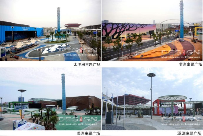 世博園240多個外國國家館依據(jù)所在洲的地理位置聚集分布,每個洲都有自己的主題廣場。世博是一次盛大的全球聚會,多元文化交融需要文化主題的演繹,而空間載體集中體現(xiàn)在五個主題廣場:為亞洲、大洋洲、歐洲、美洲和非洲。