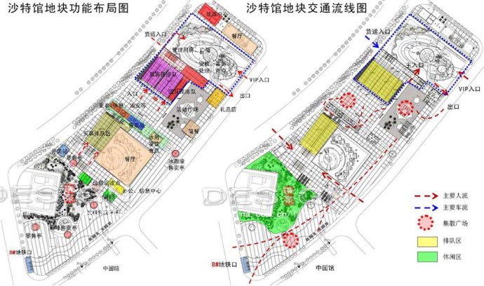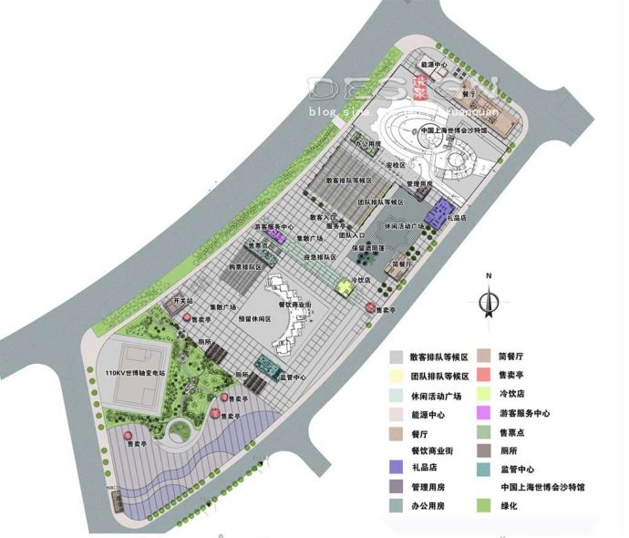 基地被人行高架分為東西兩塊。東地塊:最東側(cè)為沙特館,安檢及辦公建筑位于原沙特館入口,印度館原址設(shè)計(jì)為排隊(duì)等候區(qū),南側(cè)為休閑廣場(chǎng),在排隊(duì)等候和休閑廣場(chǎng)南側(cè)設(shè)計(jì)有禮品店(位于沙特館出口附近)、簡(jiǎn)餐廳,西側(cè)設(shè)計(jì)有游客服務(wù)中心和冷飲店(高架下);西地塊:尼泊爾館北部廣場(chǎng)東側(cè)設(shè)計(jì)有售票建筑(靠近人行高架),西側(cè)為大片的集中綠地,南側(cè)為較大的集散廣場(chǎng)。