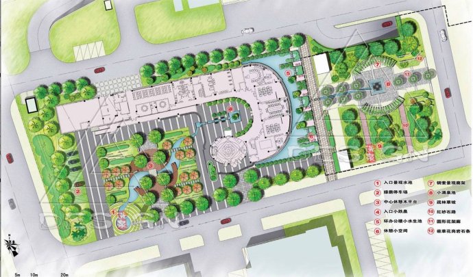 場(chǎng)地是一期綜合配套服務(wù)基地,外向臨道路,“L”形的8#辦公樓將空間環(huán)境分為東西兩部分:東側(cè)的主入口景觀空間和西側(cè)的地下車庫屋頂景觀空間。為讓空間統(tǒng)一完整,用鋪裝與景觀小品的直線、空間景觀的軸線來傳達(dá)整體的井然秩序,用水、植物、地形,以及曲線、圓形巧妙的將靈動(dòng)的空間穿插在其中,營(yíng)建環(huán)境的秩序與靈動(dòng)。