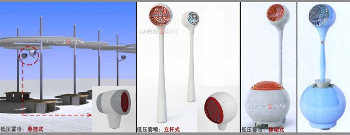 通過(guò)以上對(duì)基于人體舒適度因子的降溫四大途徑的分析,在高密度人流開(kāi)放空間中,通過(guò)以上對(duì)改善人體舒適度因子的途徑的分析,在高密度人流開(kāi)放空間中,改善人體舒適度要必須具備影響人體舒適度的四大因子。通過(guò)系統(tǒng)比較論證,在上海世博會(huì)場(chǎng)地公共空間中設(shè)計(jì)了低壓霧噴降溫系統(tǒng)和遮陽(yáng)系統(tǒng),以改善人體舒適度,從其中一個(gè)視角實(shí)現(xiàn)世博場(chǎng)地設(shè)計(jì)的人性化表達(dá)