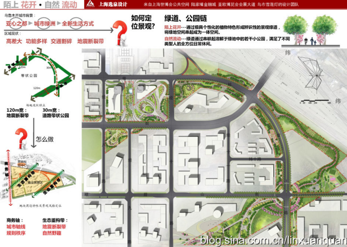 ?這些被城市道路割碎的綠地,通過(guò)場(chǎng)地中統(tǒng)一的林蔭綠道將整個(gè)綠地空間串起成為一體空間。并且通過(guò)極具個(gè)性化的植物特色營(yíng)造,如櫻花、丁香等形成辨識(shí)性的景觀大道。