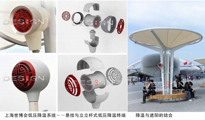 ?? 噴霧降溫終端設(shè)計以“圓融”為理念,采用簡潔的球體和柱體來演繹。出風(fēng)口裝飾紋樣采用距今四千多年前仰韶文化馬廠遺址中的陶器上的“回字體紋樣”:立桿式降溫終端采用“傳統(tǒng)四連回紋樣”,懸掛式降溫終端采用“傳統(tǒng)圓形回紋窗紋樣”。降溫終端色彩主體上采用白色,僅在出風(fēng)口的紋樣部位飾以“中國紅”,與中國館形成呼應(yīng)。通過符號、色彩、形體的對比整體上達到“傳統(tǒng)與現(xiàn)代的統(tǒng)一”。(如圖9)