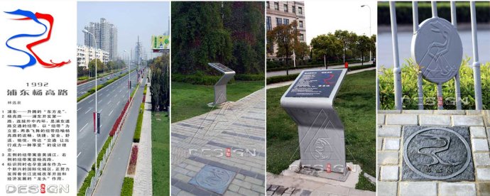 在其中的附屬設(shè)施體系中,我們創(chuàng)新性提出為楊高路創(chuàng)立“楊高路標(biāo)識”。國內(nèi)能為一條道路專門設(shè)計一個標(biāo)志的情況不多,為城市主干道設(shè)計標(biāo)識,目前在上海還是首次。針對楊高路的內(nèi)涵和個性設(shè)計了7個方案,通過新區(qū)領(lǐng)導(dǎo)和公眾參與的方式確立楊高路標(biāo)識 “楊高路東方龍”方案。楊高路標(biāo)識提升了道路的形象與地位,公眾參與的過程強(qiáng)化了大眾對楊高路的認(rèn)知,提升楊高路的市容景觀,增強(qiáng)其文化品味,體現(xiàn)其自身特色。