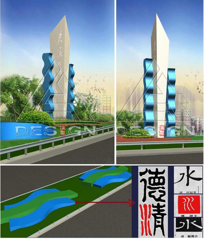 英溪大橋橋銘牌(見(jiàn)圖6)形態(tài)豎直高聳與橋塔風(fēng)格統(tǒng)一,設(shè)計(jì)理念來(lái)源于德清西部莫干山的動(dòng)人傳說(shuō)――莫邪干將鑄就的雌雄寶劍,秉承劍的文化。主牌體旁是兩個(gè)流暢的藍(lán)色的水狀雕塑,傳達(dá)著水的概念,與德清江南水鄉(xiāng)、古代防風(fēng)文化、橋域的下渚湖風(fēng)景旅游區(qū)濕地的地域文化吻合。同時(shí)藍(lán)色的水狀雕塑形式上來(lái)源于漢字小篆體“水”的寫(xiě)法,來(lái)傳達(dá)德清的歷史悠久,并與機(jī)非分隔帶 “水暢想”的藍(lán)色景觀媒介體相呼應(yīng),給觀者以強(qiáng)烈的視覺(jué)沖擊,和無(wú)限暢想,帶著心靈的震撼進(jìn)入橋主體。